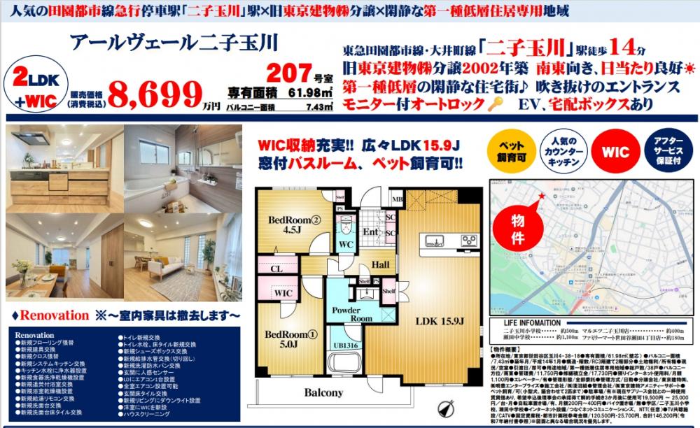 アールヴェール二子玉川≪新規内装リノベーション実施≫の自社物件WEBチラシ情報 | 豊島区・中野区・新宿区の中古マンション・リノベーション情報なら池袋のアイベックスホーム!