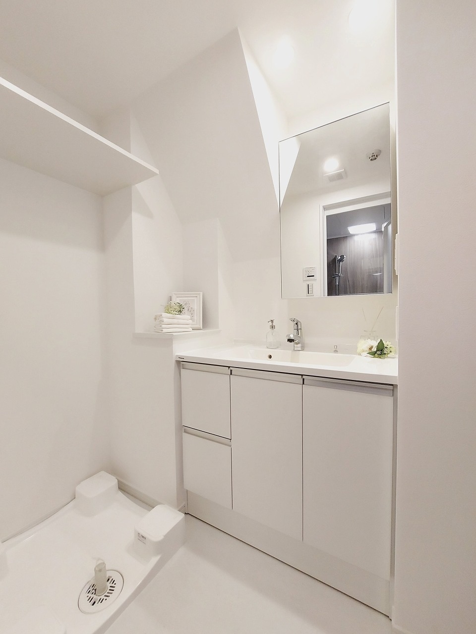 ホワイトカラーの洗面化粧台 ミラー裏面は収納スペース