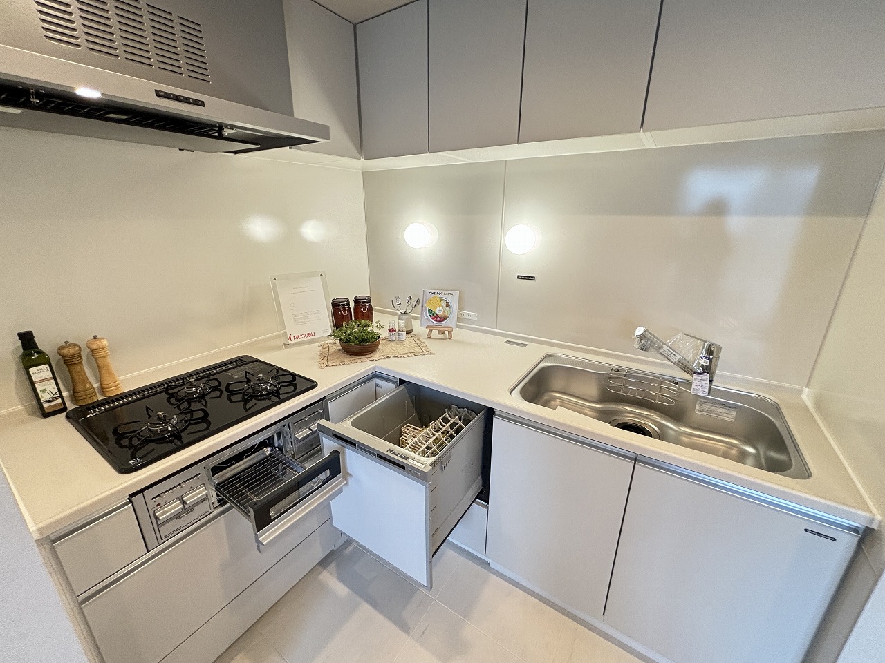 食洗機、浄水器内臓水栓がございます お料理がしやすい3口ガスコンロ