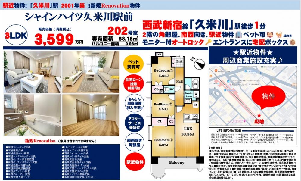 シャインハイツ久米川駅前≪新規内装リノベーション実施≫の自社物件WEBチラシ情報 | 豊島区・中野区・新宿区の中古マンション・リノベーション情報なら池袋のアイベックスホーム!